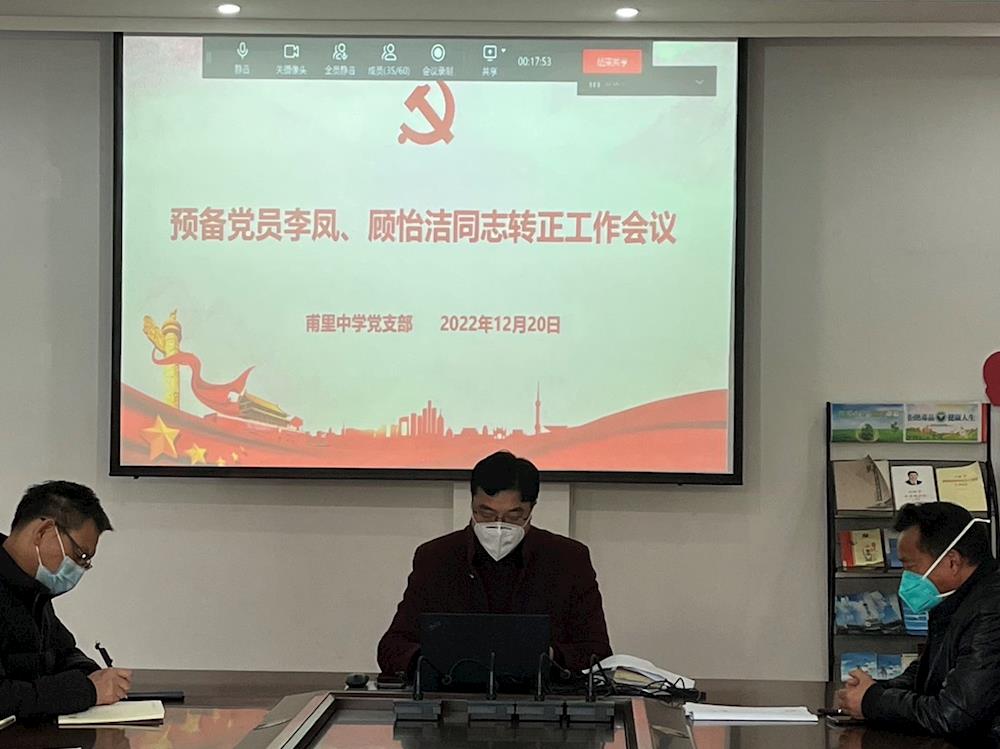 随后,讨论李凤、顾怡洁同志申请转为正式党员的事宜。李凤、顾怡洁同志汇报了一年来自己在思想、学习、工作、生活等方面的情况,并表达了渴盼按期转为中共正式党员的愿望。随后,入党介绍人、与会党员对李凤、顾怡洁同志在预备考察期间的表现情况进行了评价,表达是否同意其转正。经与会正式党员无记名线上投票表决,同意李凤、顾怡洁同志按期转为中共正式党员。