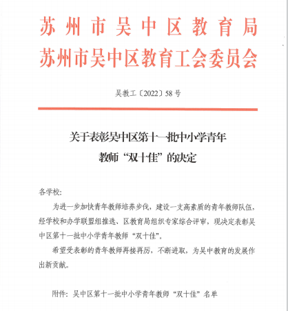 近日,吴中区第十一批中小学青年教师“双十佳”评选结果公布,beat365中国唯一官网王冬虹老师喜获吴中区中小学青年教师“双十佳”。