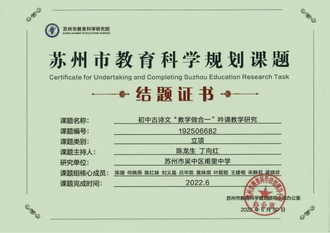2017年至2018年完成市级教育科学规划课题《基于学科特色的合理组合学习方式的研究》,并在区教科研成果评选中获得贰等奖。2019年至2022年完成市级规划课题陶研专项《初中古诗文吟诵“教学做合一”研究》,2020申报的省级教育科学规划叶研专项课题《叶圣陶教育思想视域下的初中古诗文吟诵校本课程的研究》已进入开发资源、总结提炼、落地推广环节,预计明年结题。