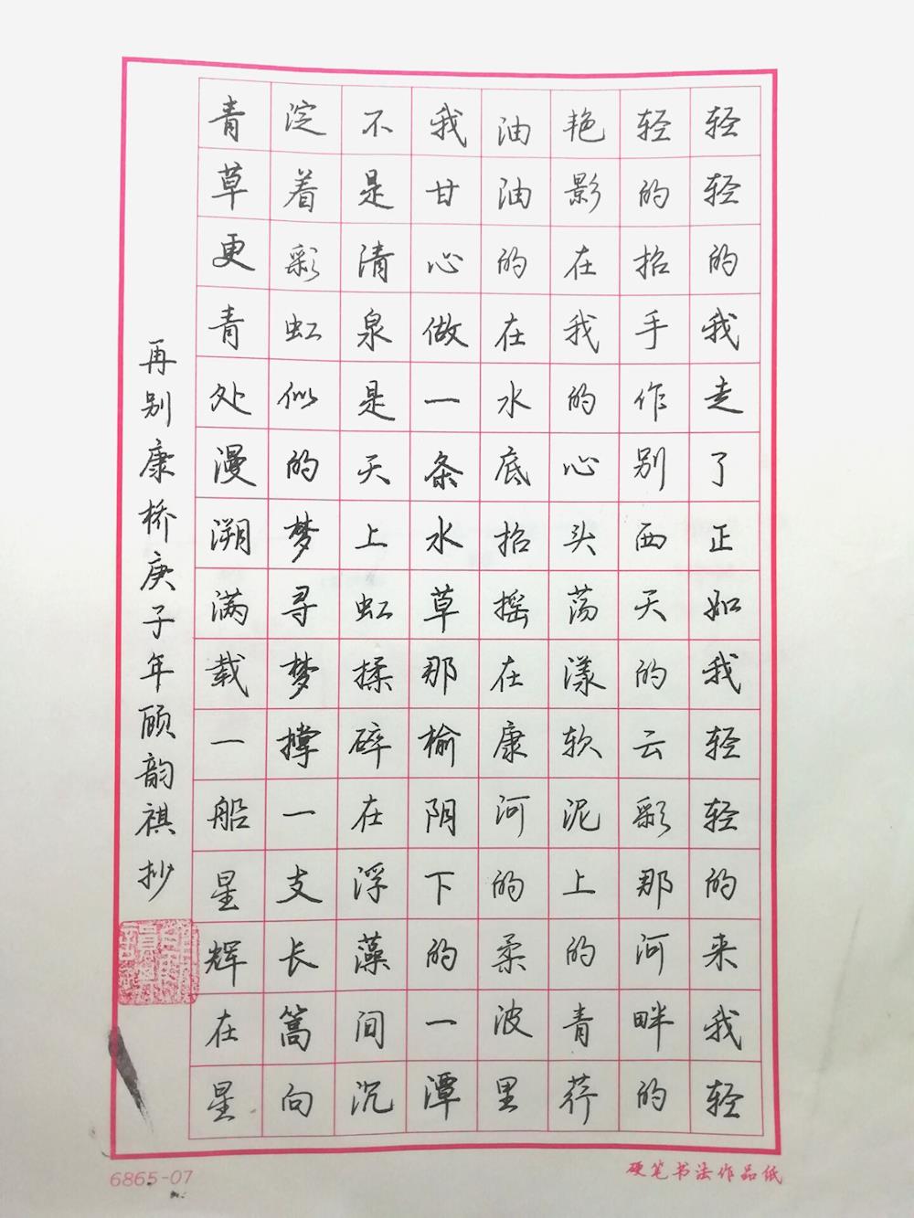 顾云琪自述:谈及书法,我与它也算有段奇缘。我母亲写得一手好字,她自然希望我亦能如此。可并不如愿,儿时的我并不喜欢写字。倒是后来,学校有书法考级之事,我极想参加。母亲是唯一支持我的,我也认真起来了。一个暑假,每日五页字,我便在这墨香中渐渐成长起来了。一路走来,也获得不少奖项。原来成功最需要的还是坚持。但最能让我开心的不过是在忙碌的学业中偶能闻到这淡淡的清香,便足矣。