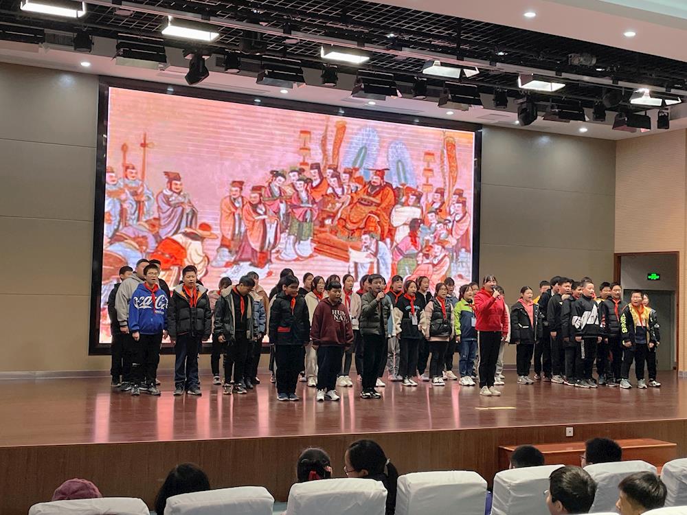 在气势磅礴的毛泽东诗词后,身着汉服的初一(16)班尤文雅同学为大家带来了一首《黄河颂》,勾起了多少人对黄河母亲的深情。而后,初二(1)班付思辰同学的以《茅屋为秋风所破歌》,抒发了“大庇天下寒士俱欢颜”的壮志。