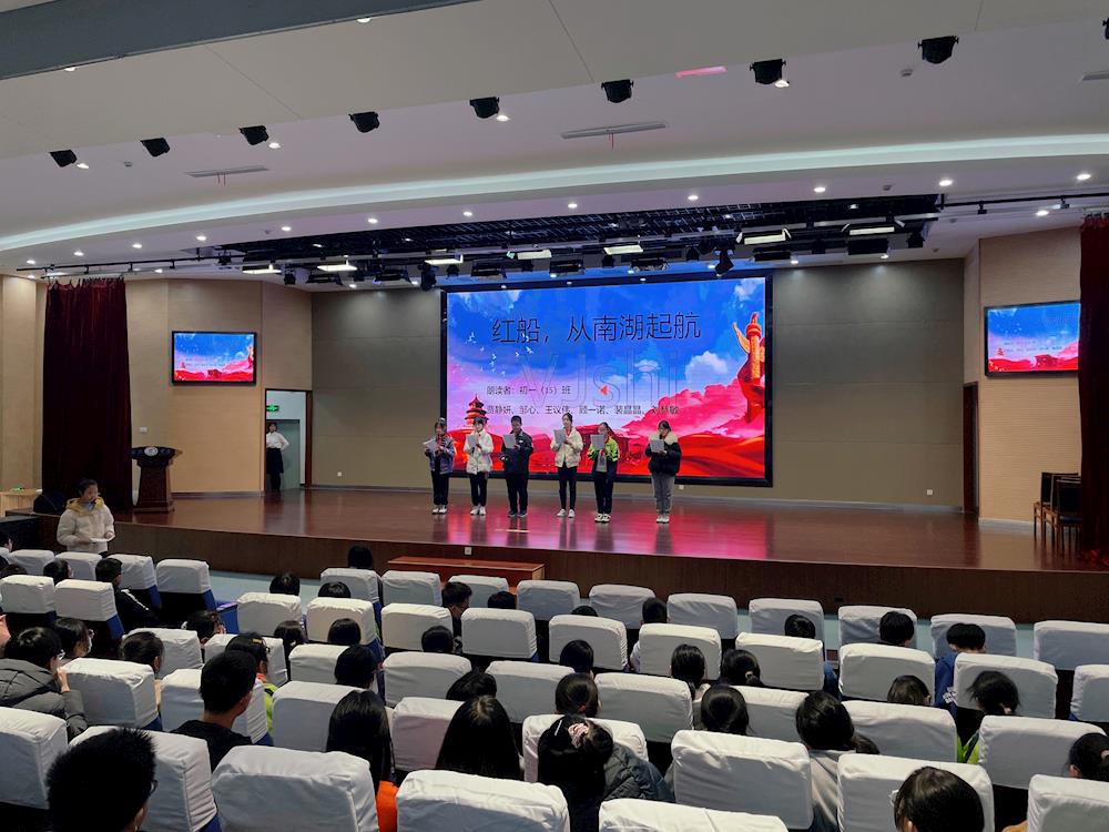 首先进行展示的是初一(15)班的六名同学。《红船,从南湖启航》一诗带领观众们回到了嘉兴南湖的那条小船上,见证了中国共产党的诞生,见证了百年来我党艰苦卓绝努力,与那傲人的成果。初一(18)班的《红星璀璨》紧随其后,述说着那不朽的爱国情怀。接着,初二(2)班的马姝玙同学带来了本次比赛的首个单人朗诵《忆秦娥·娄山关》,也是首个古诗词朗诵节目,将本词的豪迈气势展现得淋漓尽致。