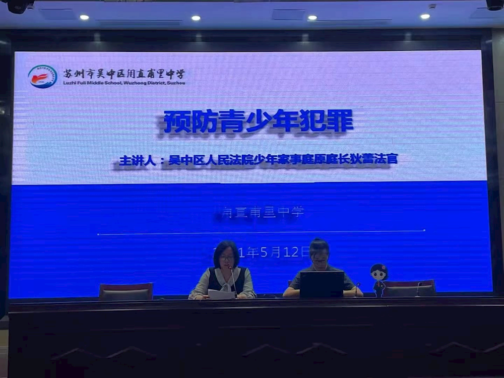 5月12日下午,为预防青少年犯罪,努力维护社会安定团结,甫里中学举行了“预防青少年犯罪”专题讲座。活动由初一年级组长周燕老师主持,吴中区人民法院少年家事庭原庭长狄蕾法官主讲,初一全体师生参加了本次讲座。