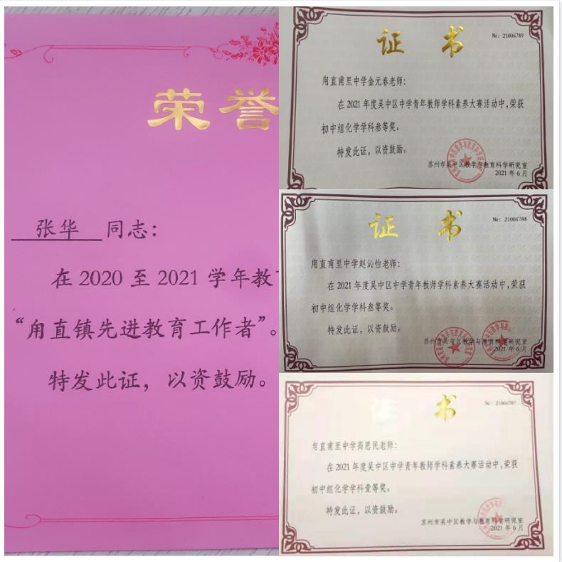高恩民老师获得吴中区青年教师基本功大赛二等奖,紧接着上岗第三年的金元春老师和赵沁怡老师获得2021年吴中区学科素养大赛的三等奖。张华老师在2020年~2021学年初中高质量发展绩效考核中,荣获初三年级化学学科“优秀教师”称号。